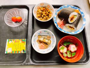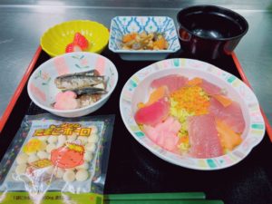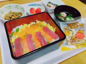 神明会直営給食部門では昼食に『ちらし寿司』『巻き寿司』を提供しました。