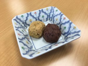 今回の会議では提供する『おはぎ』の試食 大きさ・ベタツキ・硬さなど…